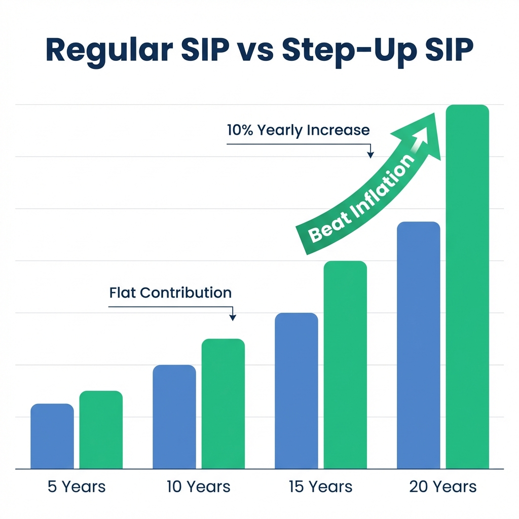 - Inflation gap: At 6% inflation, the step-up keeps pace with lifestyle creep and tuition/healthcare costs better than a flat SIP.